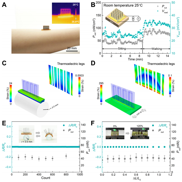 要點(diǎn):1、在行走情況下,典型的運(yùn)動(dòng)腕帶大小的熱電器件可提供5V的開(kāi)路電壓和12.5 μW的輸出功率,足夠直接驅(qū)動(dòng)大部分低功率無(wú)線傳感器節(jié)點(diǎn)。2、器件在極端變形下,作為功能性部位的熱電材料上的應(yīng)變量極低。因此在承受超過(guò)1000次3.5mm小半徑彎曲疲勞試驗(yàn)以及120%拉伸變形后,輸出性能不發(fā)生任何衰減。