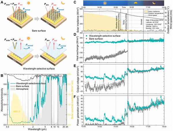 要點(diǎn):波長(zhǎng)選擇性超材料薄膜可以有效反射可見(jiàn)光,并且同時(shí)利用大氣透明窗口(8-13μm波段)實(shí)現(xiàn)空間輻射制冷,從而顯著提升戶外日間陽(yáng)光直射條件下熱電器件的輸出。