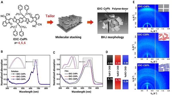 圖1. (A)材料設(shè)計(jì)與思路;(B-C)吸收光譜;(D)分子軌道能級;(E)GIWAXS二維圖