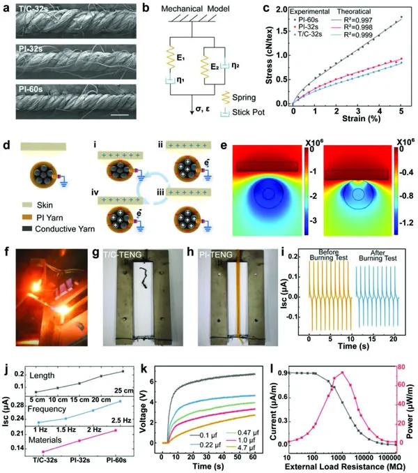 a)TENG紗線(比例尺:500 μm)的SEM圖像,分別為T/C-32s,PI-32s和PI-60s。b)TENG紗線非線性力學(xué)性能的本構(gòu)模型的圖示(注:σ表示TENG紗線上的應(yīng)力,ε表示TENG紗線的應(yīng)變,E1和E2表示虎克彈簧的彈性模量,η1和η2分別表示代表皮層紗和芯紗的黏壺的粘滯系數(shù)。c)TENG紗線的應(yīng)力-應(yīng)變曲線與模型預(yù)測結(jié)果的比較,為實(shí)驗(yàn)結(jié)果提供預(yù)測依據(jù)。e)COMSOL模擬的不同狀態(tài)下的電位分布。f)阻燃性能測試:g)T/C-32s TENG在燃燒測試后繼續(xù)燃燒成灰燼,h)PI-32s FRTY在燃燒測試后外觀保持穩(wěn)定,i)測試后電氣輸出性能僅略有下降。j)不同材料、頻率和長度的TENG紗線的短路電流。k)PI-32s FRTY在1 Hz頻率和30 N力作用下的電容充電能力。l)在1 Hz頻率和30 N力作用下,在不同的外部負(fù)載電阻作用下測量PI-32s FRTY的電流和峰值功率。