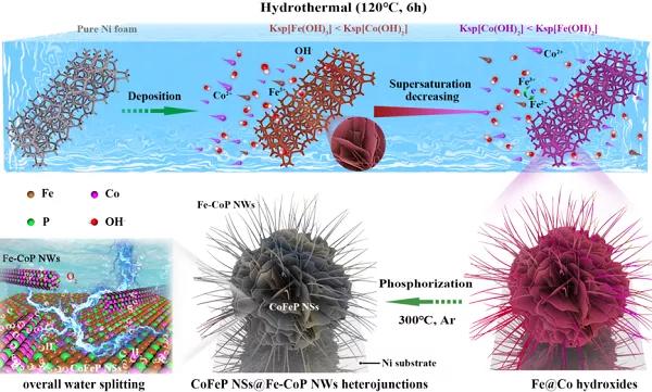 圖1. 2D/1D CoFeP NSs@Fe-CoP NWs催化劑制備過程的示意圖