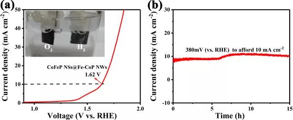 a)CoFeP NSs@Fe-CoP NWs樣品的極化曲線圖;b)CoFeP NSs@Fe-CoP NWs樣品在恒電位下的耐久性測(cè)試圖。該研究首次通過過飽和觸發(fā)維度和相控生長策略構(gòu)建2D/1D CoFeP NSs@Fe-CoP NWs異質(zhì)結(jié)構(gòu),且此催化劑表現(xiàn)出優(yōu)越的HER,OER和全水解電催化性能。該合成策略能夠用于設(shè)計(jì)具有優(yōu)異的多功能電催化性能的2D/1D磷化物異質(zhì)結(jié)構(gòu)催化劑,也將為推進(jìn)能源相關(guān)應(yīng)用的多維納米結(jié)構(gòu)開辟另一種途徑。