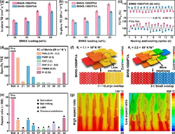 復(fù)合薄膜的(a)面內(nèi)熱擴散系數(shù)和(b)熱導(dǎo)率與BNNS長徑比及含量之間的關(guān)系。(c) BNNS-1500/PVA (83 wt%)的冷熱循環(huán)測試(d)樣品與文獻中報道的氮化硼基復(fù)合材料的比TCE值比較,以及(e)上述復(fù)合材料所使用的填料長徑比對比。(f)大長徑比BNNS聲子傳輸優(yōu)勢的機理解釋及(g)基于有限元分析的大小長徑比BNNS傳熱能力的對比。