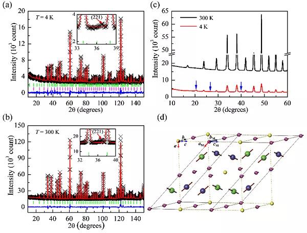 圖2 CaCu3Fe2Ta2O12在(a) 4 K和(b) 300 K時的中子衍射精修圖,(c) 4 K和300 K的低角度的中子衍射數(shù)據(jù),其中藍色箭頭表示核衍射和磁衍射之間的差異。(d) CaCu3Fe2Ta2O12在4 K時的磁結(jié)構(gòu)。其中虛線坐標軸表示晶格基矢量(a,b,c),實線坐標軸表示磁基矢量(aM,bM,cM)。