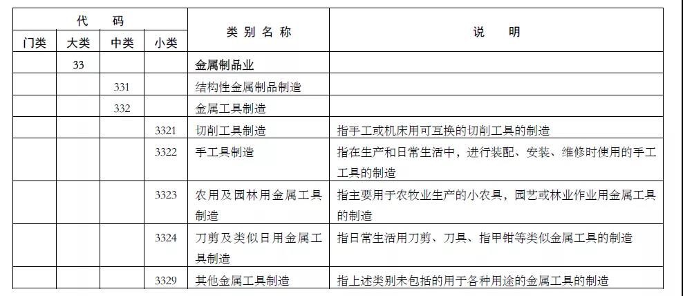 再比如二級(jí)分類(大類)中33是金屬制品業(yè),其下面的三級(jí)分類(種類)332金屬工具制造中,3321切削工具制造就已經(jīng)是該分類目錄中第四級(jí)的最終分類了。然而,對于業(yè)內(nèi)的從業(yè)者來說,這個(gè)分類實(shí)在是太粗糙了。