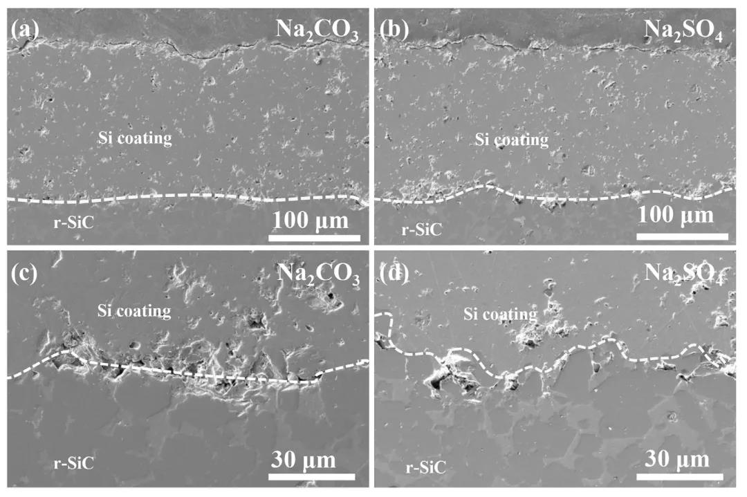 圖 3 為 Si 涂層的截面形貌和涂層 - 基體的界面形貌。從低倍形貌(圖3(a) 和 3(b))可以看出,Si 涂層較為致密,與 SiC 陶瓷界面結(jié)合緊密。從高倍形貌(圖 3(c) 和 3(d))可以看出,經(jīng) Na2CO3熔鹽腐蝕試樣的基體-涂層界面處存在較多的孔洞,而 Na2SO4 熔鹽腐蝕試樣基體 - 涂層界面缺陷較少。