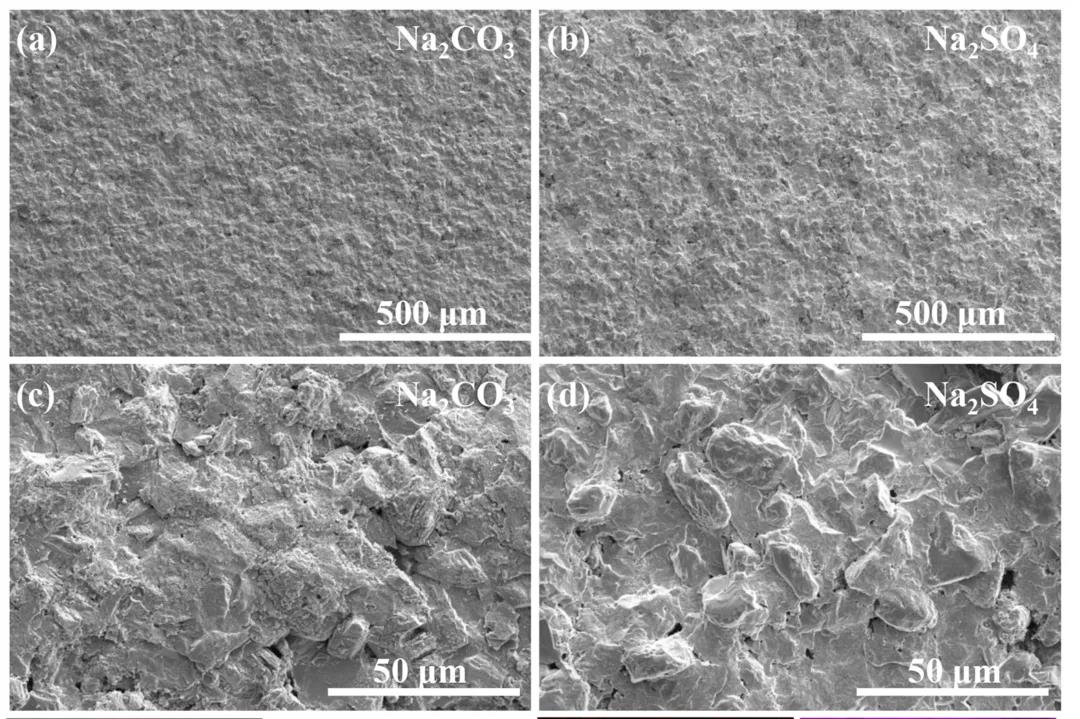 (a), (c) Na2CO3 熔鹽 900℃處理 4 h; (b), (d) Na2SO4 熔鹽 900℃處理 4 h