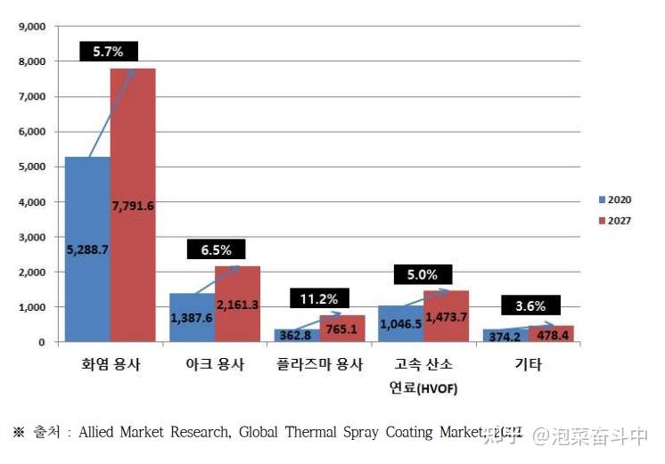讓我們定睛來看一下,雖然等離子熱噴涂的全體市場(chǎng)占比不是最高的,但是它的增速卻是所有噴涂方法中最快的。達(dá)到了11.2%。
