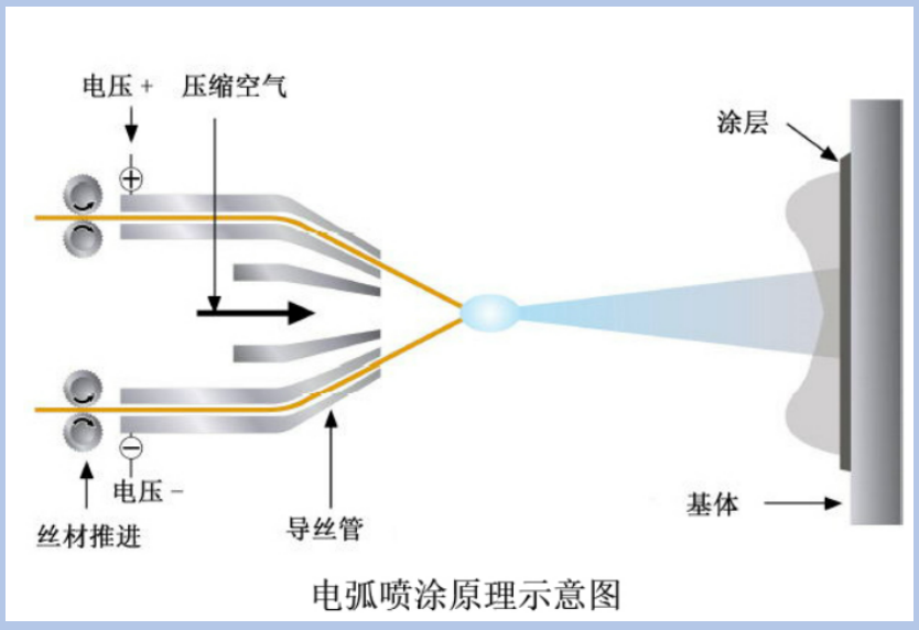 電弧噴涂的基本原理是將兩根被噴涂的金屬絲作自耗性電極,連續(xù)送進(jìn)的兩根金屬絲分別與直流的正負(fù)極相連接。在金屬絲端部短接的瞬間,由于高電流密度,使兩根金屬絲間產(chǎn)生電弧,將兩根金屬絲端部同時(shí)熔化,在電源作用下,維持電弧穩(wěn)定燃燒;在電弧發(fā)射點(diǎn)的背后由噴嘴噴射出的高速壓縮空氣使熔化的金屬脫離金屬絲并霧化成微粒,在高速氣流作用下噴射到基材表面而形成涂層。值得注意的是電弧噴涂只能用于具有導(dǎo)電性能的金屬線材。