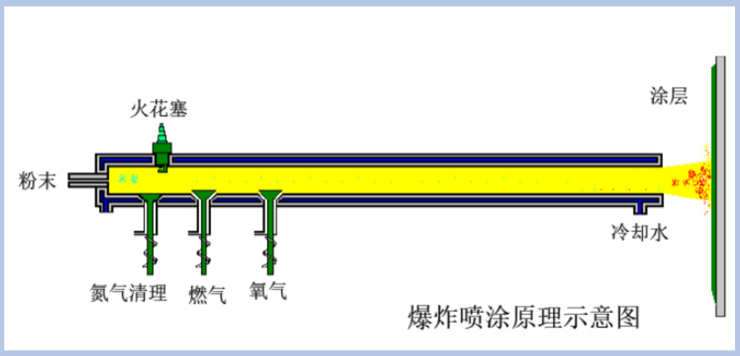 爆炸噴涂是在特殊設(shè)計(jì)得燃燒室內(nèi)加入一定比例搭配的氧氣和燃?xì)猓缓罄命c(diǎn)燃混合氣體發(fā)生爆炸所產(chǎn)生強(qiáng)大的熱量和推力將粉末材料熔化后高速噴向工件表面的過程,每次噴射后通入氮?dú)饬髑逑礃尮?。爆炸噴涂由于其推力大、速度快,因此能夠?qū)崿F(xiàn)涂層的高結(jié)合強(qiáng)度和低孔隙率。缺陷是爆炸畢竟是非持續(xù)性的間歇過程,因此想要噴涂均勻的涂層挑戰(zhàn)性蠻大。