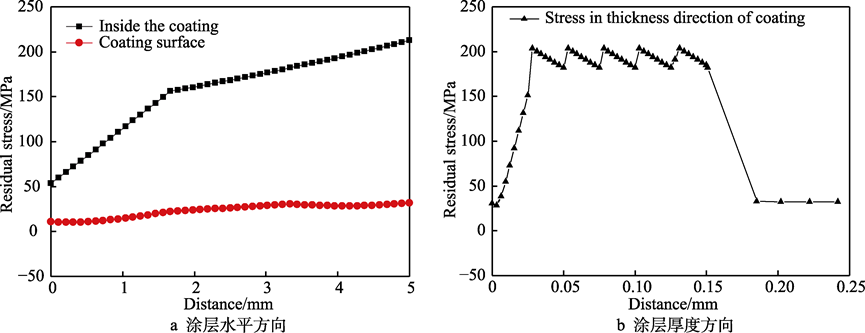 2)使用X射線衍射儀檢測(cè)噴涂冷卻后的涂層,試驗(yàn)表明,噴涂涂層殘余應(yīng)力為180~185 MPa拉應(yīng)力,在計(jì)算機(jī)模擬結(jié)果范圍之內(nèi),且試樣在拉伸試驗(yàn)后涂層應(yīng)力得到一定程度的釋放。